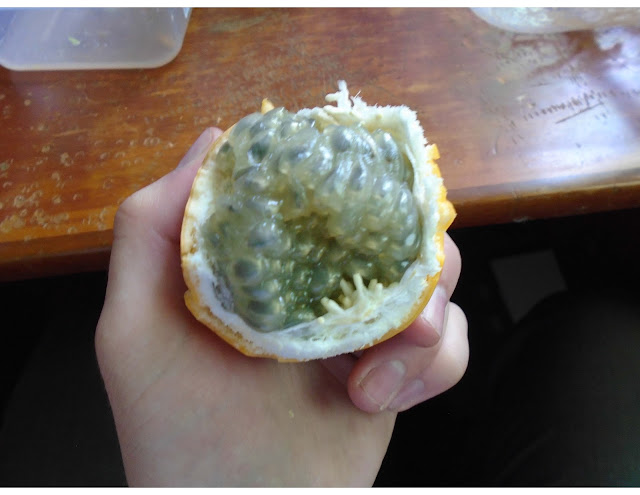 This fruit is called granadilla, it looks like fish eggs but it's actually not bad. Kind of crunchy. We eat them a lot.